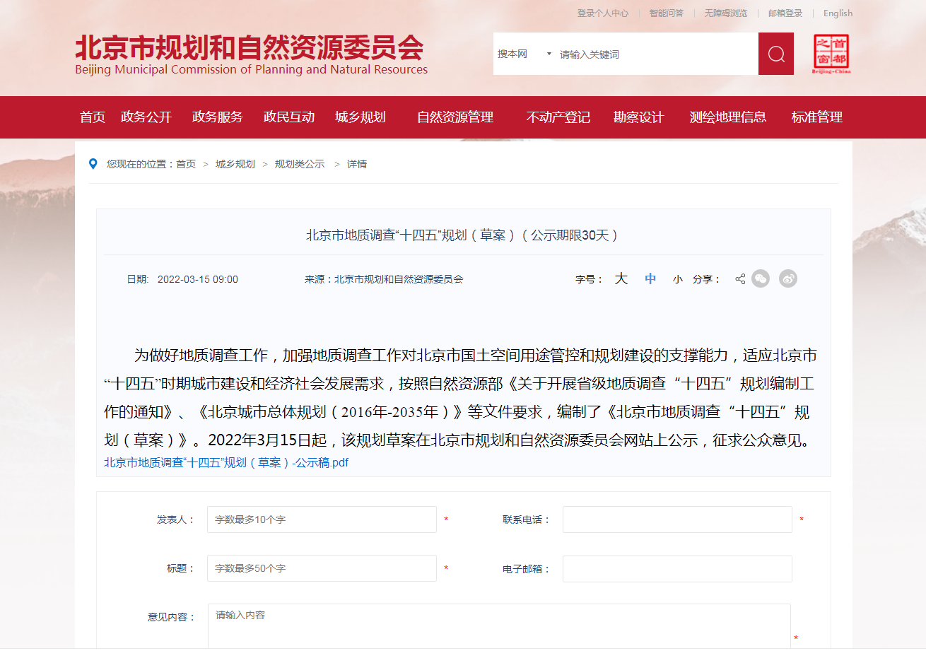 地大熱能地?zé)?多能互補(bǔ)網(wǎng)訊:《北京市地質(zhì)調(diào)查“十四五”規(guī)劃(2021—2025年)(草案)》(以下簡(jiǎn)稱《草案》)3月15日起在市規(guī)劃自然資源委網(wǎng)站公示,聽(tīng)取公眾意見(jiàn),公示期30天?!?a href="http://www.kcsoundproductions.com/t/規(guī)劃.html" >規(guī)劃》提出,北京市將率先對(duì)首都功能核心區(qū)地?zé)崮?/a>等開(kāi)展綜合地質(zhì)調(diào)查評(píng)價(jià),提供地質(zhì)安全保障。社會(huì)公眾對(duì)該《規(guī)劃》如有意見(jiàn)建議,可在4月14日前登錄北京市規(guī)劃自然資源委網(wǎng)站留言。