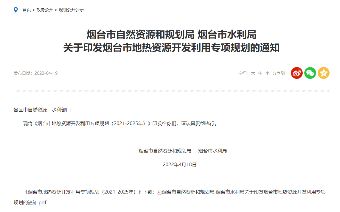 地大熱能地熱+多能互補新聞網訊:近日,煙臺市自然資源和規(guī)劃局、煙臺市水利局聯(lián)合印發(fā)了《煙臺市地熱資源開發(fā)利用專項規(guī)劃(2021-2025年)》(以下簡稱《規(guī)劃》)。