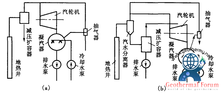 閃蒸地?zé)岚l(fā)電系統(tǒng)是一種比較適用于中低溫地?zé)崴?/a>發(fā)電的系統(tǒng)(又稱“減壓擴(kuò)容法”),圖1所示為這種系統(tǒng)的流程圖。來(lái)自地?zé)峋?/a>的熱水首先進(jìn)入閃蒸器(減壓擴(kuò)容器)(圖1-a),容器內(nèi)維持著比熱水壓力低的壓力,因而部分熱水得以閃蒸并將產(chǎn)生的蒸氣送往汽輪機(jī)膨脹做功發(fā)電。如地?zé)峋?/a>口流體是濕蒸氣(圖1-b),則先進(jìn)入汽水分離器,分離出的蒸氣送往汽輪機(jī)做功發(fā)電,分離剩余的水再進(jìn)入閃蒸器,閃蒸后得到的閃蒸蒸氣也送往汽輪機(jī)做功。