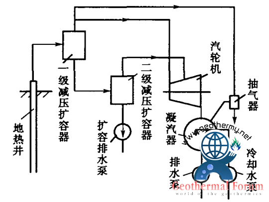 圖2是多級(jí)閃蒸(多級(jí)減壓擴(kuò)容)蒸氣循環(huán)的流程圖。從井口流出的熱水先進(jìn)入第一級(jí)減壓擴(kuò)容器,產(chǎn)生的蒸氣進(jìn)入汽輪機(jī)的高壓部分,而從第一級(jí)閃蒸器底部出來(lái)的閃蒸后的剩余熱水再進(jìn)入第二級(jí)閃蒸器(擴(kuò)容器),產(chǎn)生二次閃蒸蒸氣,并通往汽輪機(jī)低壓部分做功。若井口出來(lái)的是濕蒸氣,則直接進(jìn)入汽水分離器,蒸氣分離出來(lái)后去高壓部分做功,熱水再進(jìn)入第二級(jí)閃蒸器(減壓擴(kuò)容器),所以實(shí)際上是用一個(gè)汽水分離器代替了第一級(jí)閃蒸器,如(圖1-b)所示。第二級(jí)閃蒸器分離出來(lái)的熱水壓力若高于大氣壓力,則熱水可以自行排出;不然,就要用排水泵抽出。閃蒸器的級(jí)數(shù)增加,單位質(zhì)量工質(zhì)輸出功也增加,即地?zé)崴?/a>中的能量愈能得到充分利用。當(dāng)級(jí)數(shù)無(wú)限多時(shí),理論上可以得到最大的輸出功,增益達(dá)到極限。但是,級(jí)數(shù)增加將使設(shè)備投資增加,系統(tǒng)變得復(fù)雜,所以實(shí)際采用的閃蒸級(jí)數(shù)一般不超過(guò)四級(jí)。地?zé)崃黧w溫度高可以級(jí)數(shù)多些,熱水溫度較低時(shí)就不宜采用二級(jí)以上的閃蒸系統(tǒng)。
