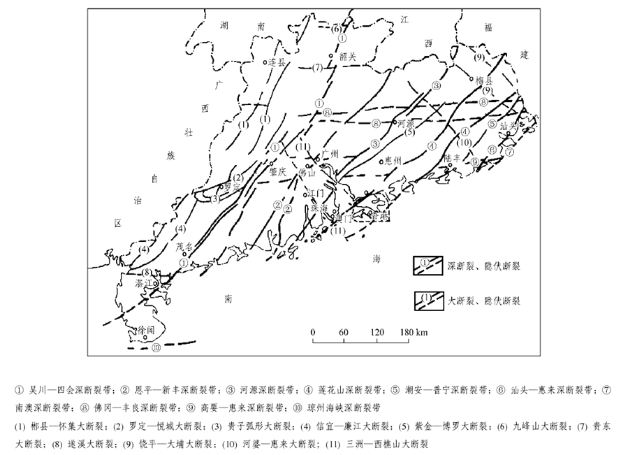 廣東省在大地構造上屬華南褶皺系的一部分,其演化過程經歷了三個發(fā)展階段及相應的構造旋回和構造運動:加里東運動形成緊密線型褶皺,主要呈NEE方向,成為廣東省構造骨架的基礎;印支運動形成多方向的過渡型蓋層褶皺;燕山運動以斷塊造山、NE向和EW向深大斷裂控制的火山噴發(fā)、巖漿侵入為主。深大斷裂對廣東省的沉積建造、巖漿活動、變質作用和成礦作用有較明顯的控制。主要的深斷裂有吳川-四會、恩平-新豐、河源、蓮花山、潮安-普寧、汕頭-惠來、南澳、佛岡-豐良、高要-惠來、瓊州海峽等,主要的大斷裂有郴縣-懷集、羅定-悅城、貴子、信宜-廉江、紫金-博羅、九峰山、貴東、遂溪、饒平-大埔、河婆-惠來、三洲-西樵山等。這些深大斷裂都具有規(guī)模大、活動時間長等特點。從總體上看。廣東省境內大型褶皺和深大斷裂以NE向為主,間夾EW向和NW向構造組成復雜的構造圖景。