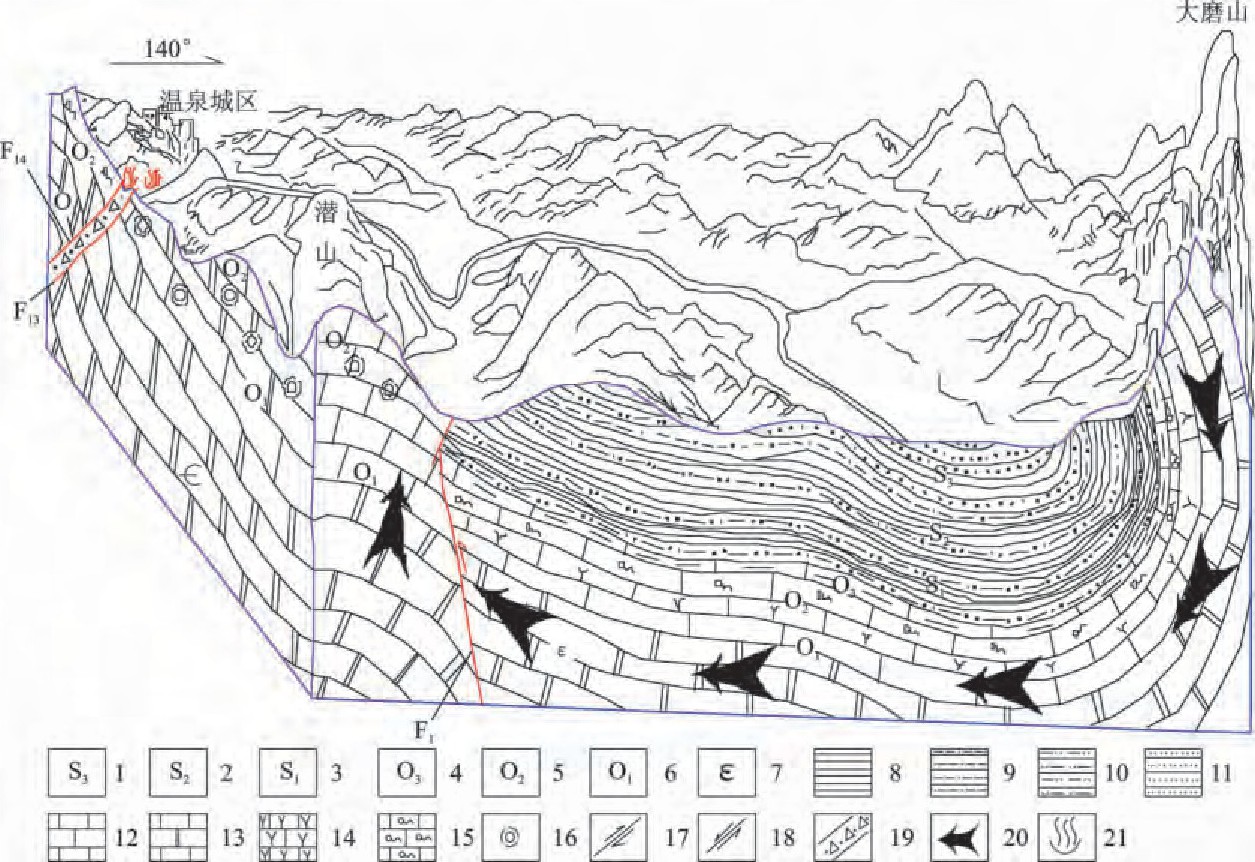 咸寧深層地?zé)豳Y源屬于深循環(huán)加熱型, 主要來源高山大氣降水經(jīng)過遠(yuǎn)程地下運(yùn)移過程中吸收大地熱流釋放熱能而逐漸增溫。咸寧城區(qū)地?zé)醽碓粗饕獮闁|南部與潛山背斜相距8 km的大磨山背斜之高山裸露奧陶系灰?guī)r受大氣降水所致 (大磨山高程高出潛山高程20倍, 兩地呈不對(duì)稱“U”型箱狀構(gòu)造) 。