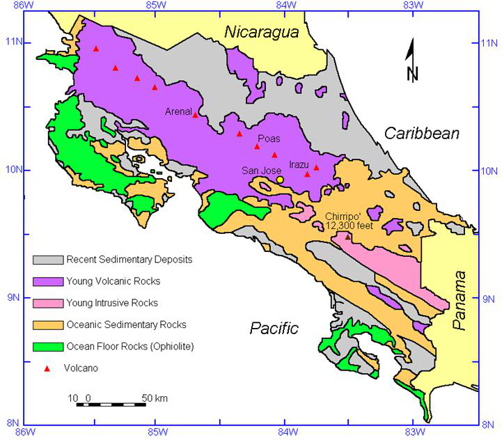 哥斯達黎加位于中美洲地峽,屬于北美洲,北緯10°,西經(jīng)84°。東臨加勒比海西靠北太平洋,有著1290千米有著1290千米的海岸線(東岸加勒比海212千米,西岸太平洋1016千米)。哥斯達黎加北部與尼加拉瓜接壤(邊境線長309千米),東南偏南與巴拿馬接壤(邊境線長639千米)??偣灿?1100平方公里,其中領(lǐng)土50660平方公里,領(lǐng)海440平方公里,比美國的西弗吉尼亞州稍小,相當(dāng)于愛爾蘭。森林覆蓋率為51%。哥斯達黎加的地形是:海岸邊是平原,而中部被崎嶇的高山所隔絕。該國宣布其專屬經(jīng)濟區(qū)為200海里,領(lǐng)海為12海里。氣候?qū)儆跓釒Ш蛠啛釒В€有一部分是新熱帶。