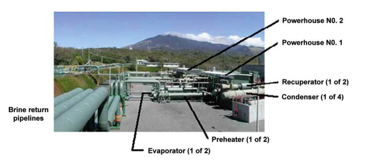 米拉瓦列斯的五號發(fā)電機組是2004年剛投入使用的。這個發(fā)電機利用從一號和二號和三號發(fā)電機組中的廢棄鹵水,通過注入井來獲取了可能回到熱儲層中的能量??偣驳陌l(fā)電量是15.5MW,發(fā)電機組中的每一個發(fā)電單元都發(fā)出7.75MW的電。每一個發(fā)電單元是有兩個渦輪組成的,驅(qū)動同一個發(fā)電機。循環(huán)工質(zhì)是常規(guī)的正戊烷,C5H12。每一個單元用兩個預(yù)熱器。兩個蒸發(fā)器跟他們各自的分隔板。兩個回?zé)崞?,四個水冷凝器。這個發(fā)電機組是有澳瑪特(Ormat)提供的。