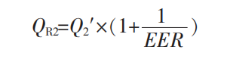 式中:QR1 為巖土體提供熱量;Q1′為建筑空調(diào)總熱負荷, 2963 kW;cop 為熱泵機組制熱性能系數(shù),5.0。由式(1)得QR1=2370.4 kW, 即巖土體吸熱量2370.4 kW,滿足建筑供暖需求。巖土體制冷量計算見式(2)。